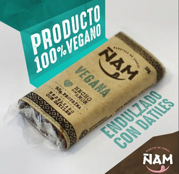 La barrita ÑAM Vegana está endulzada con dátiles y su envoltorio es totalmente biodegradable.